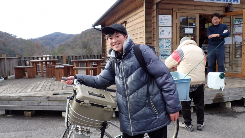 昨日。。。FLたかみやのホームページを見たら~~トラック直接放流の速報~~!!これは行かねば!!と、なんと~~!!朝4時に起きて3時間かけて自転車で釣りに来てくれました✨✨愛車の箱付き自転車&ブラッドリーくんと一緒に記念撮影~~✨✨ヒットポイントは中の島~~!!✨✨ハリはこんなに伸ばされていました!!(´艸`*)[釣果情報]