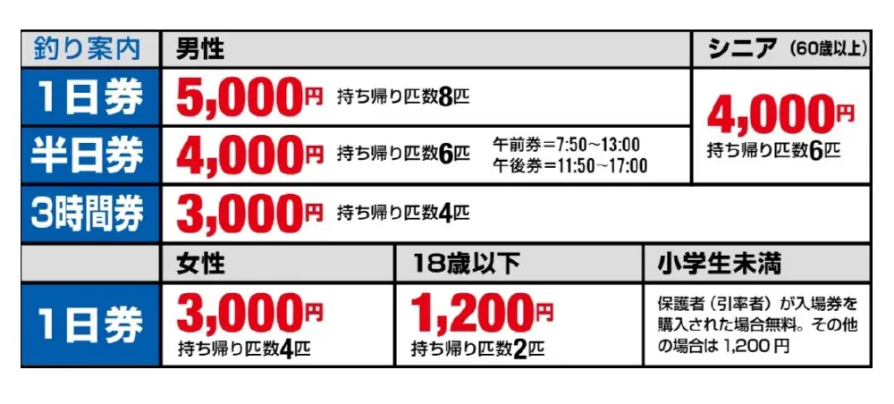 お持ち帰りの匹数内において魚種や大きさなどの制限はありませんが、匹数以上のお持ち帰りの場合は追加料金が発生します。