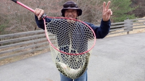 えん堤手前では魚影が少なくなったので遠投で40センチオーバーを2匹~~✨✨めっちゃ引きが良くて大満足~~!!数も釣れたし気分良いときに帰りま~~す(^^♪♪♪と、満足の早上がり✨✨当面の間、50センチオーバーのお魚の持ち帰り匹数は2匹までとさせていただきます。3時間券と子供券は1匹です。ご協力をお願いいたします。m(__)m 全体のお持ち帰り匹数はかわりませんのでよろしくお願いいたします。