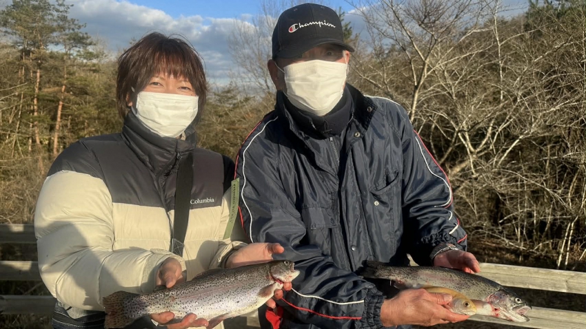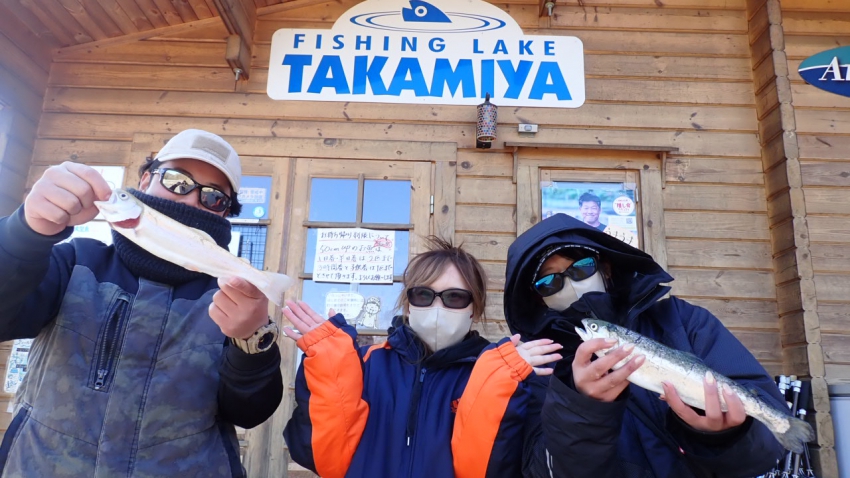 FLたかみや☆はじめましてのご夫婦~~!!みごと!!サクラマスをペアでGET~~✨✨今日も楽しくみんなでフィッシング~~✨✨当面の間、50センチオーバーのお魚の持ち帰り匹数は2匹までとさせていただきます。3時間券と子供券は1匹です。ご協力をお願いいたします。m(__)m 全体のお持ち帰り匹数はかわりませんのでよろしくお願いいたします。