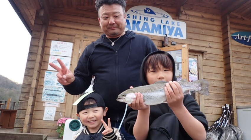 FLたかみや初めての親子さん!!ラッキーくん釣ってスプーンゲット〜!!当面の間、50センチオーバーのお魚の持ち帰り匹数は2匹までとさせていただきます。3時間券と子供券は1匹です。ご協力をお願いいたします。m(__)m 全体のお持ち帰り匹数はかわりませんのでよろしくお願いいたします。
