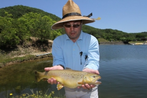 雨の日が多く、流れ込む水量が安定しているため、表層の暖かい水は押し出されています。天然の掛け流しレイク的な状況で表水温は17度台。深場はもっと冷たいでしょう。したがって、トップやドライフライでも良く釣れています。ただし、日中は晴れるとルアーセレクトが必要になります。