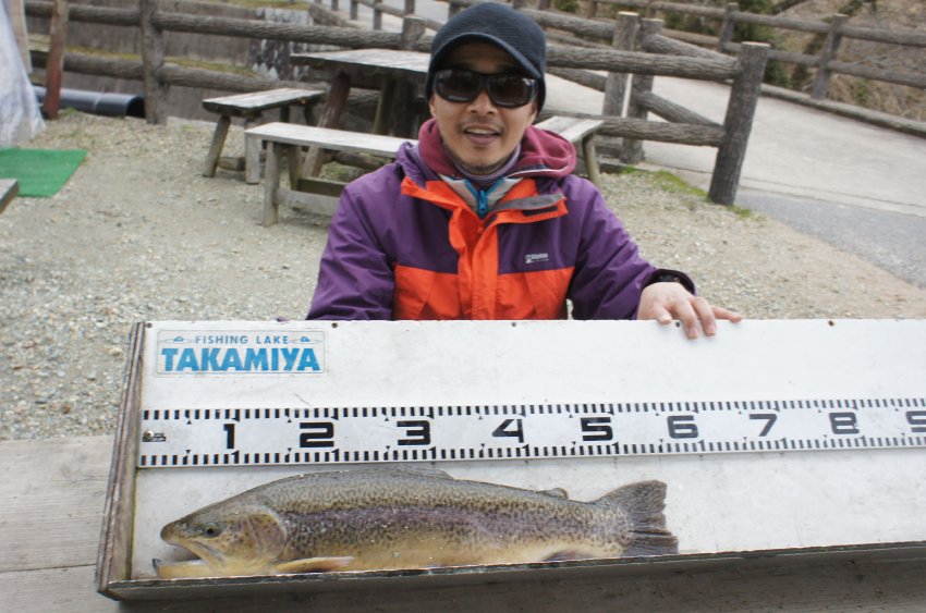 FLたかみやの桜はほぼ満開です。まとまった雨で、魚の活性が非常に高く、昼までにルアーで50匹超えも・・・大型魚のアタリも多く、引きが強いコンディションのトラウトは、2ポンドラインではかなりきつそうです。明日、あさっては、二日間で1000匹以上のギンザケを放流します。