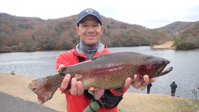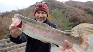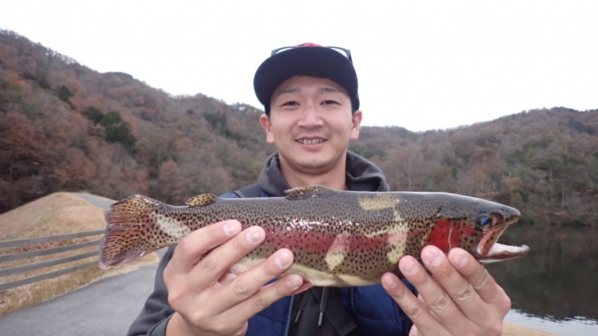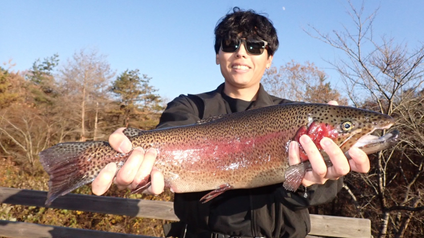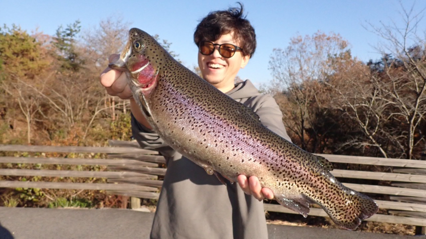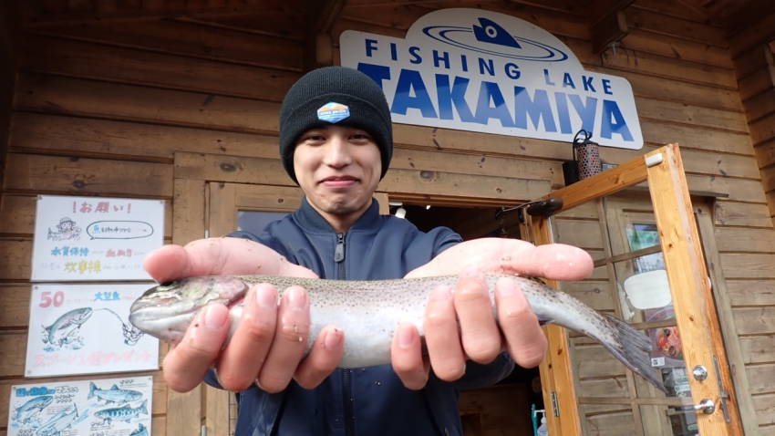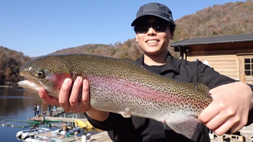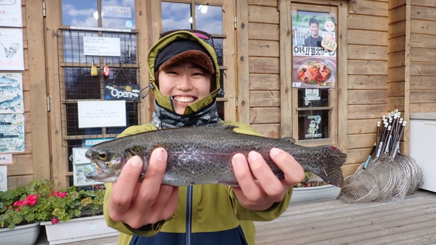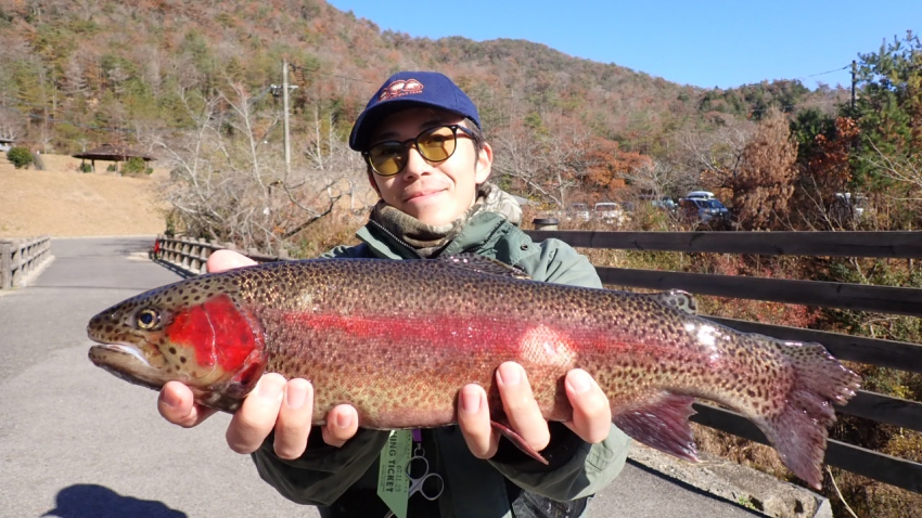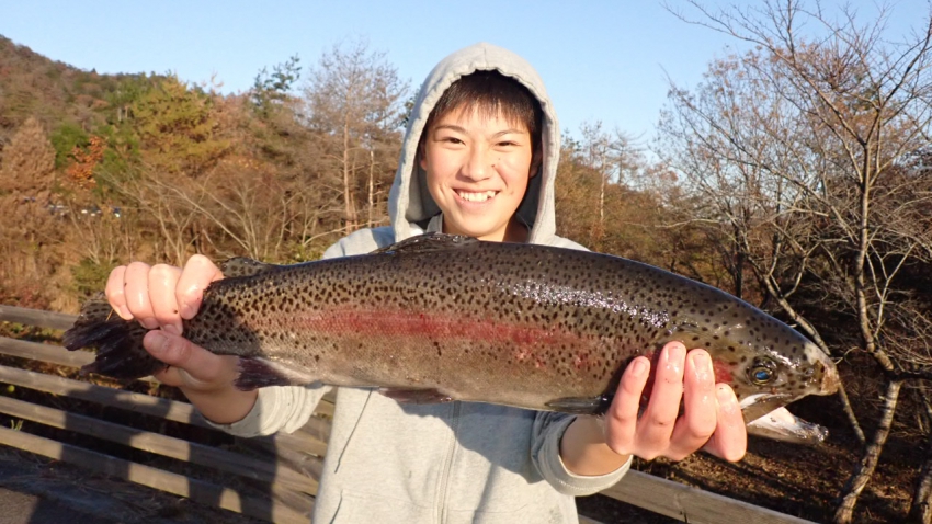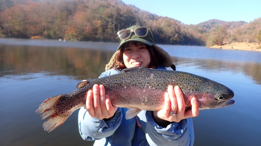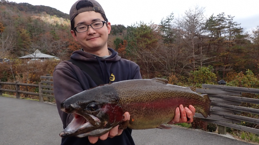 管釣りデビュー!!なかなか良いサイズのレインボー!!ナイスフィッシング~!!(≧▽≦)