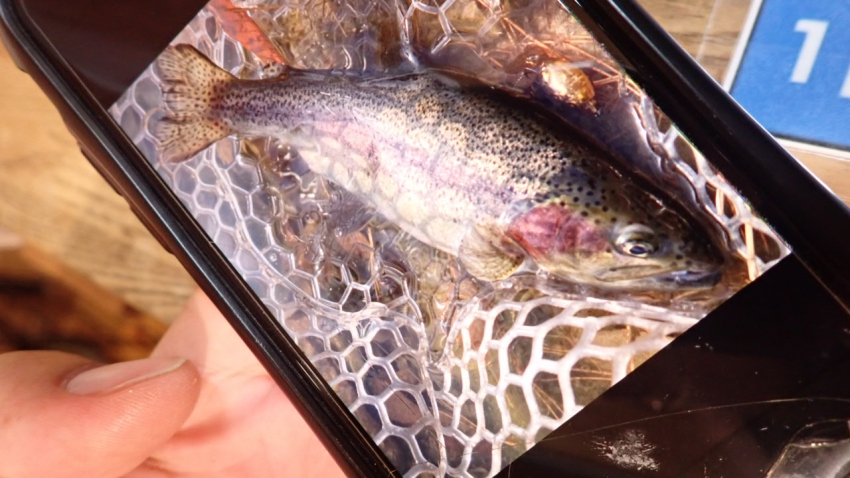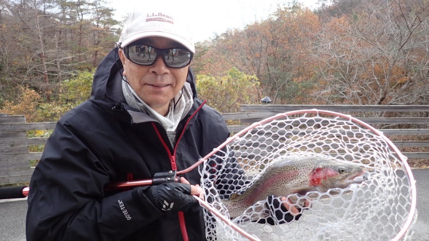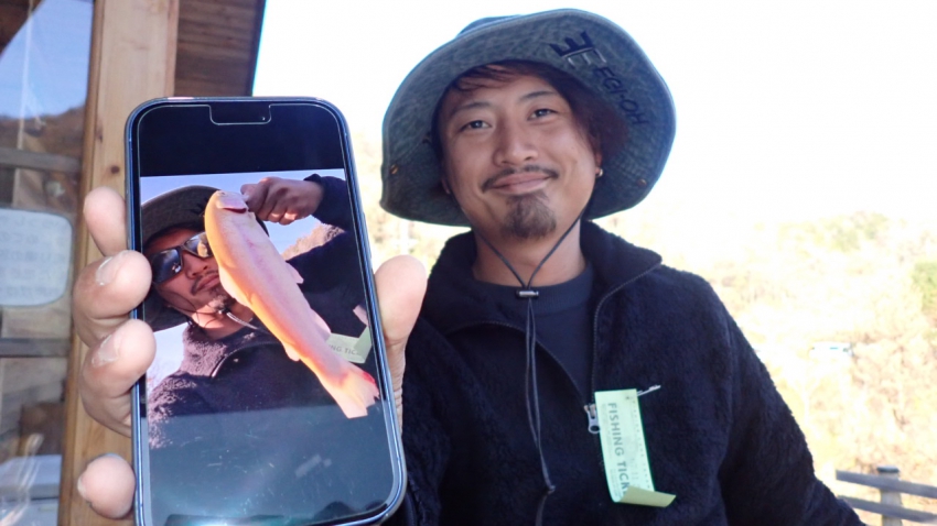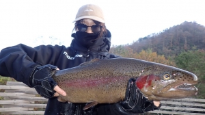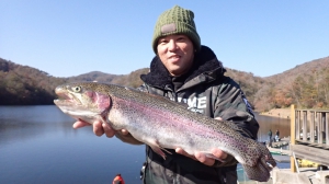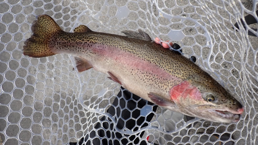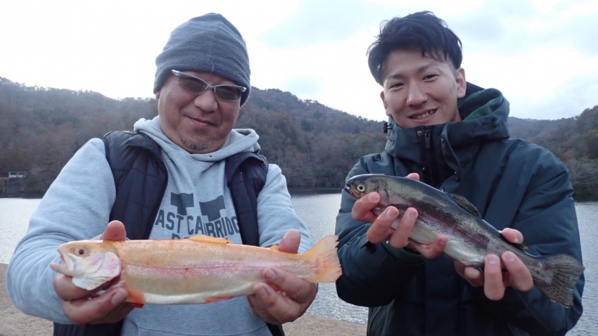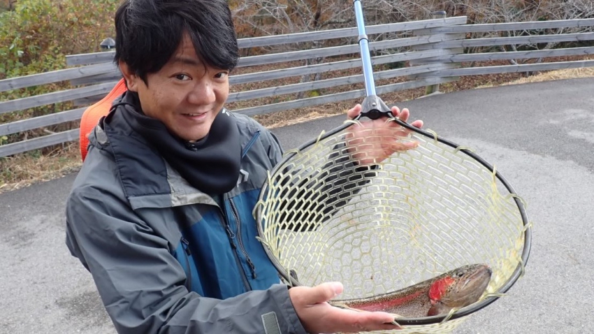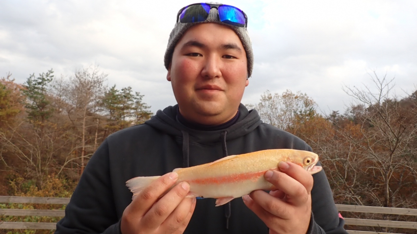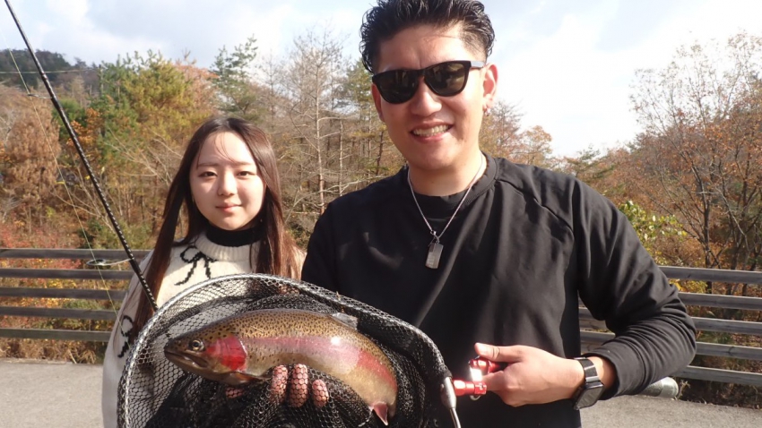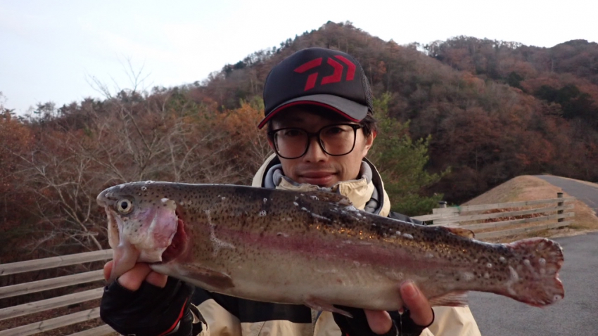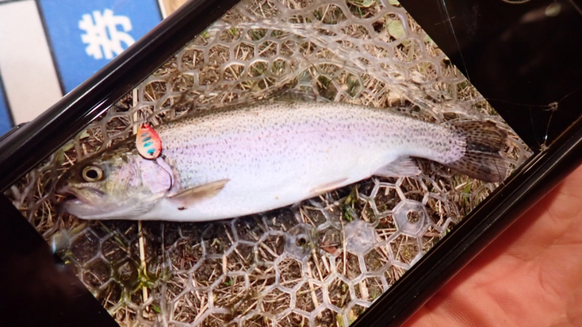 管釣りデビュー!!なかなか良いサイズのレインボー!!ナイスフィッシング~!!(≧▽≦)