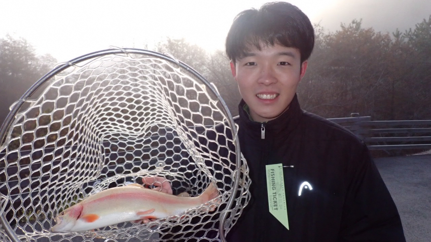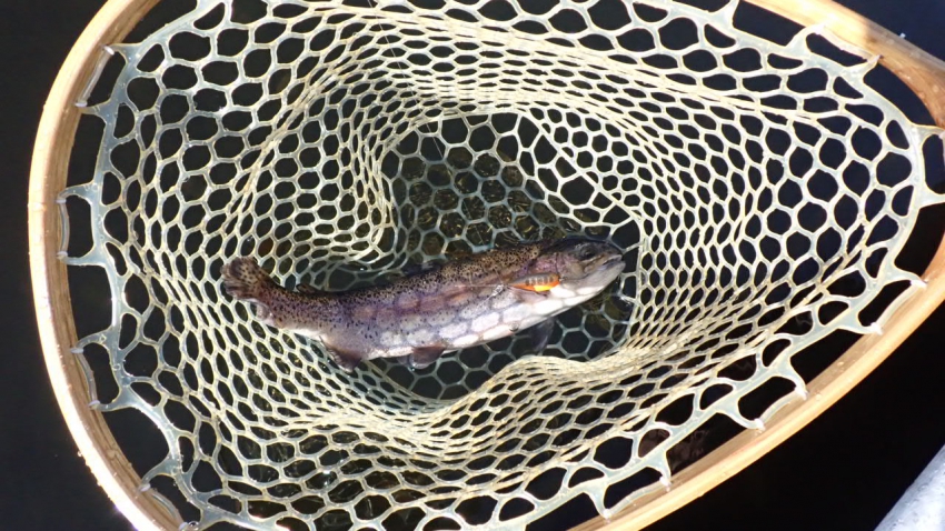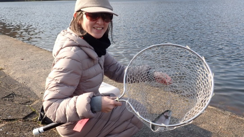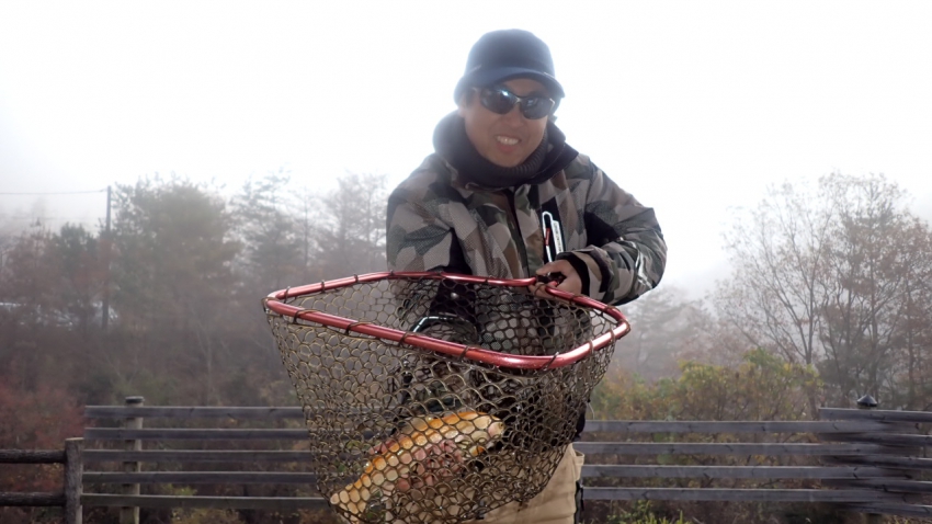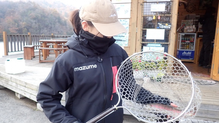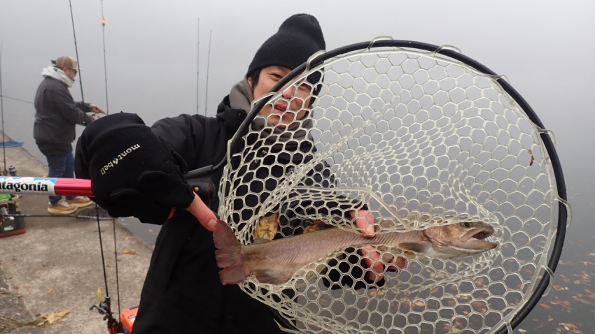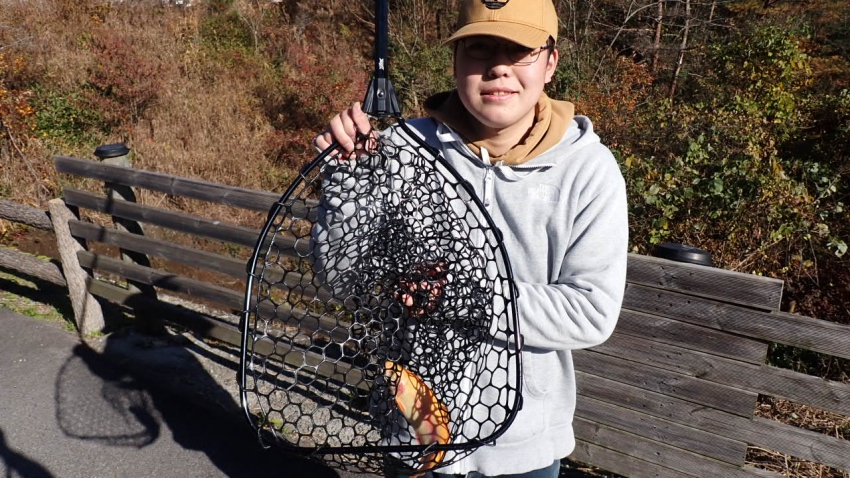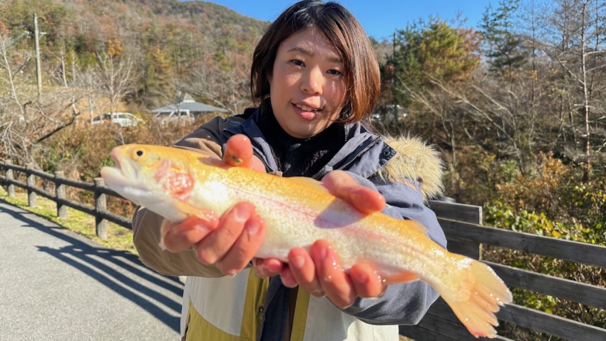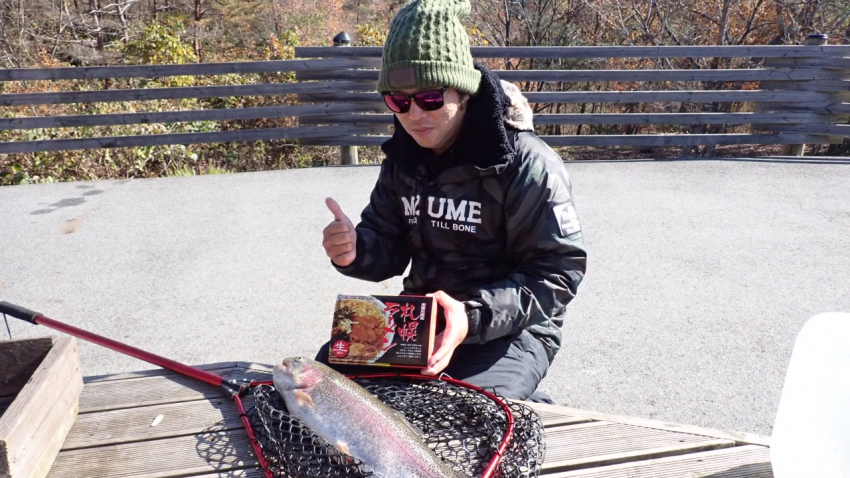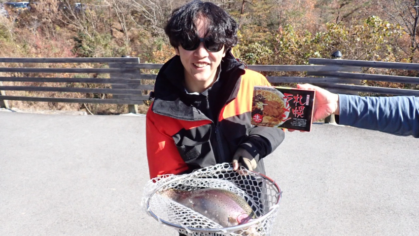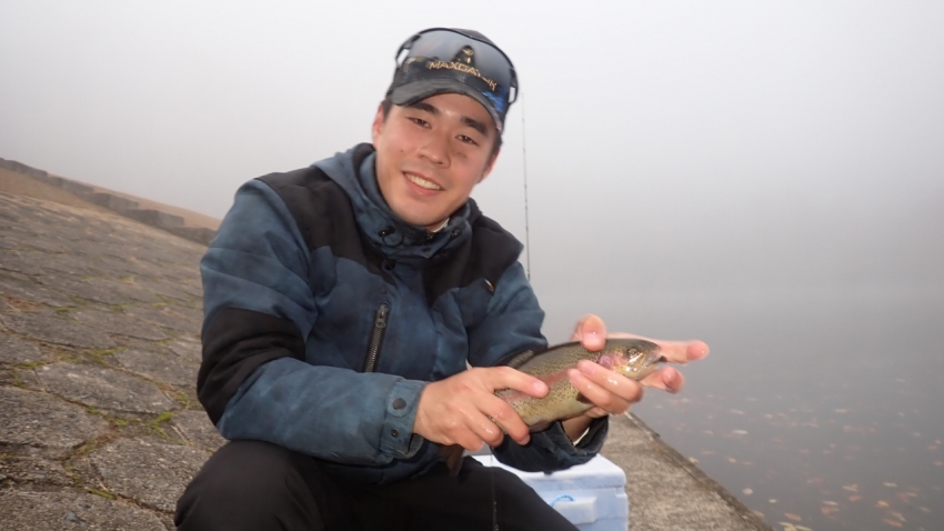 管釣りデビュー!!なかなか良いサイズのレインボー!!ナイスフィッシング~!!(≧▽≦)